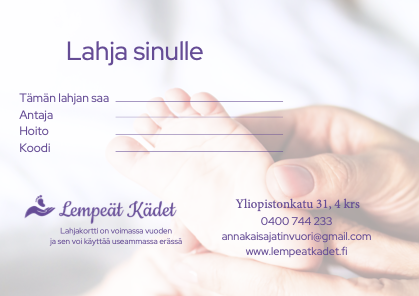 Lempeiden Käsien lahjakortteja on saatavilla kaikkiin palveluihini.